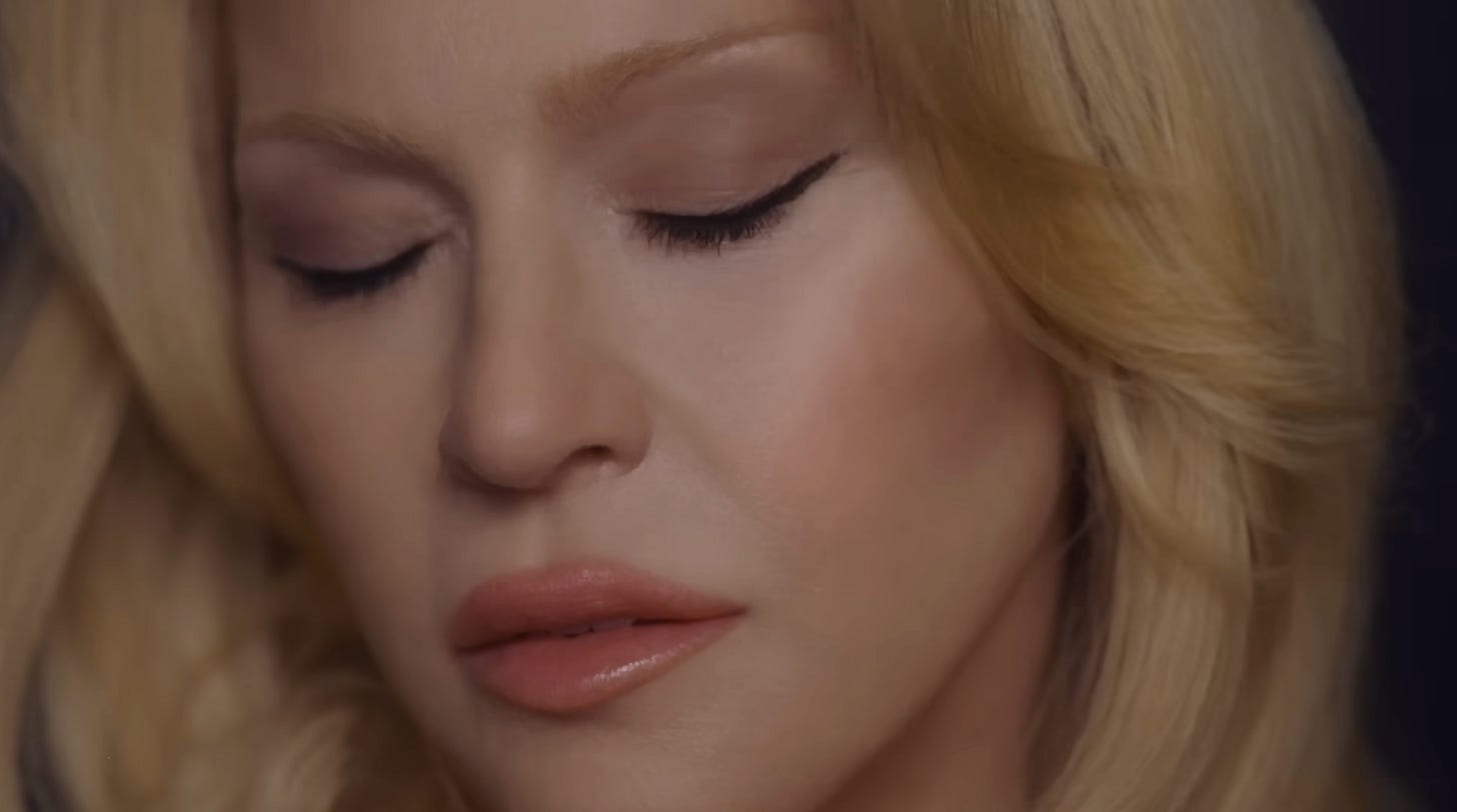 Madonna’s provides a sleek and elegant interpretation, almost Fellini-esque. The arrangement also echoes Maurizio and Guido De Angelis’s soundtrack to Paolo Poeti’s Inhibition, which tells the story of a wealthy heiress who, after years of sexual humiliation at the hands of her sadistic husband and his friends, struggles to regain her sense of identity, and finds an outlet in sexually dominating behaviors towards her young secretary.